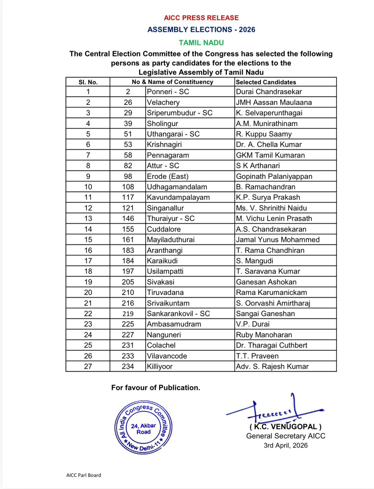 காங்கிரஸ் வேட்பாளர் பட்டியல் வெளியிடப்பட்டு உள்ளது. திமுக கூட்டணியில் காங்கிரஸ் கட்சிக்கு 28 தொகுதிகள் ஒதுக்கப்பட்டு உள்ளன. இதில், மேலூர் சட்டப்பேரவை தொகுதியை தவிர, 27 தொகுதிகளின் வேட்பாளர் பட்டியலை காங்கிரஸ் தலைமை வெளியிட்டுள்ளது. காங்கிரஸ் கட்சியில் அண்மையில் இணைந்த ஜி.கே.மணியின் மகன் ஜி.கே.எம்.தமிழ்குமரனுக்கு பென்னாகரத்தில் போட்டியிட வாய்ப்பு வழங்கப்பட்டுள்ளது.