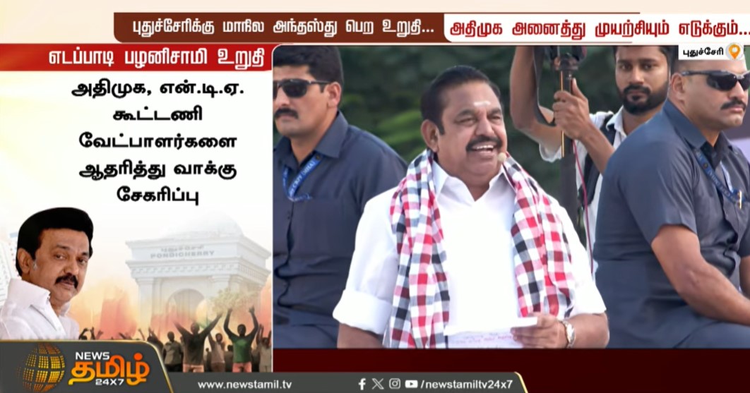 புதுச்சேரிக்கு மாநில அந்தஸ்து பெற்றுத் தர அனைத்து முயற்சிகளையும் அதிமுக மேற்கொள்ளும் என எடப்பாடி பழனிசாமி உறுதி அளித்தார். புதுச்சேரியில் கம்யூனிஸ்ட் கட்சிகளை கூட்டணியில் சேர்க்காதது ஏன்? என திமுகவுக்கு கேள்வி எழுப்பிய அவர், தமிழ்நாட்டில் ஒரு நிலைப்பாடு புதுவையில் ஒரு நிலைப்பாடு என முதலமைச்சர் மு.க.ஸ்டாலின் இரட்டை வேடம் போடுவதாகவும் குற்றம்சாட்டினார்.