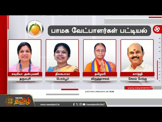 தமிழ்நாடு சட்டப்பேரவைக்கு வரும் 23.04.2026ஆம் நாள் நடைபெறவிருக்கும் தேர்தலில், அ.இ.அ.தி.மு.க. தலைமையிலான தேசிய ஜனநாயகக் கூட்டணியில் பாட்டாளி மக்கள் கட்சிக்கு 18 தொகுதிகள் ஒதுக்கப்பட்டு உள்ளன. அவற்றில் 3 தொகுதிகளுக்கான வேட்பாளர்கள் ஏற்கனவே அறிவிக்கப்பட்டுள்ள நிலையில், மீதமுள்ள 15 தொகுதிகளில் கீழ்க்கண்டவர்கள் வேட்பாளர்களாக போட்டியிடுவார்கள் என்பதைத் தெரிவித்துக் கொள்கிறேன்.