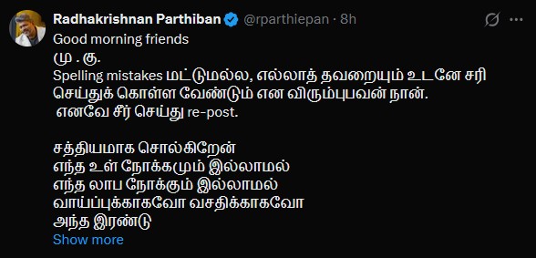 இவ்வாறு பார்த்திபன் பதிவிட்டுள்ளார்.