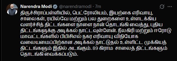 திருச்சிராப்பள்ளியில், பெட்ரோலியம், இயற்கை எரிவாயு, சாலைகள், ரயில்வே மற்றும் பல துறைகளை உள்ளடக்கிய வளர்ச்சித் திட்டங்களை நாளை (மார்ச் 11ஆம் தேதி) நான் தொடங்கி வைத்து, புதிய திட்டங்களுக்கு அடிக்கல் நாட்ட உள்ளேன். நீலகிரி மற்றும் ஈரோடு மாவட்டங்களில் பிபிசிஎல் நகர எரிவாயு விநியோக வலையமைப்பிற்கான அடிக்கல் நாட்டுதல் உள்ளிட்ட முக்கியத் திட்டங்களும் இதில் அடங்கும். 89 கிராம சாலைத் திட்டங்களும் தொடங்கி வைக்கப்படும்.