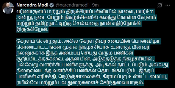 எர்ணாகுளம் மற்றும் திருச்சிராப்பள்ளியில் நாளை, மார்ச் 11 அன்று, நடைபெறும் நிகழ்ச்சிகளில் கலந்து கொள்ள கேரளம் மற்றும் தமிழ்நாட்டிற்கு செல்வதை நான் எதிர்நோக்கி இருக்கிறேன். கேரளம் சென்றதும், அகில கேரள தீவர சபையின் Akhila Kerala Dheevara Sabha பொன்விழா கொண்டாட்டங்கள் முதல் நிகழ்ச்சியாக உள்ளது. மீனவர் நலனுக்காக இந்த அமைப்பு செய்து வரும் பணிகள் குறிப்பிடத்தக்கவை. அதன் பின், அடுத்தடுத்த நிகழ்ச்சியில், பல்வேறு வளர்ச்சிப் பணிகளுக்கு அடிக்கல் நாட்டப்படும் அல்லது நிறைவடைந்த வளர்ச்சிப் பணிகள் தொடங்கப்படும் . இந்தப் பணிகள் எரிசக்தி, நெடுஞ்சாலைகள், கிராமப்புற உள்கட்டமைப்பு, ரயில்வே மற்றும் பல துறைகளைச் சேர்ந்தவை.