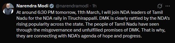 மாலை 6:30 மணியளவில், திருச்சியில் நடக்கும் தேஜ கூட்டணி பொதுக்கூட்டத்தில் தமிழகத்தின் கூட்டணி தலைவர்களோடு நானும் இணைகிறேன். தேஜ கூட்டணிக்கு மாநிலம் முழுவதும் பிரபலம் அடைந்து வருவதை கண்டு திமுக அதிர்ச்சி அடைந்துள்ளது.