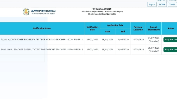 அரசு, அரசு உதவிபெறும் பள்ளிகள் மற்றும் அங்கீகரிக்கப்பட்ட தனியார் பள்ளிகளில் பணிபுரியும் ஆசிரியர்களுக்கான சிறப்பு ஆசிரியர் தகுதித் தேர்வுக்கான (TNTET - 2026) ஆன்லைன் விண்ணப்பப் பதிவு இன்று முதல் தொடங்கியுள்ளது.