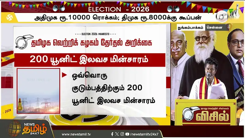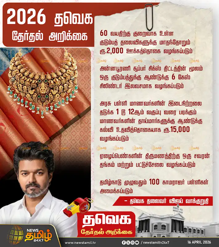 இவ்வாறு தவெக தேர்தல் அறிக்கையில் வாக்குறுதிகள் அளிக்கப்பட்டுள்ளன.