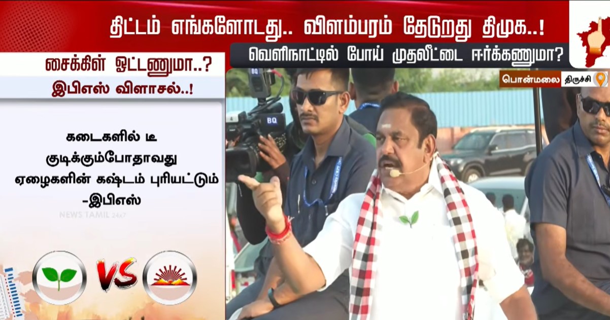 திருச்சி பொன்மலையில் அதிமுக மற்றும் அதன் கூட்டணி கட்சி வேட்பாளர்களை ஆதரித்து பிரச்சாரம் மேற்கொண்ட இபிஎஸ், தொழில் முதலீட்டை ஈர்க்கப்போகிறேன் எனக்கூறிவிட்டு வெளிநாட்டில்போய் சைக்கிள் ஓட்டுவதற்குதான் மு.க.ஸ்டாலின் முதலமைச்சர் ஆனாரா? எனவும் கேள்வி எழுப்பினார். மேலும், அவர் பேசியதாவது;