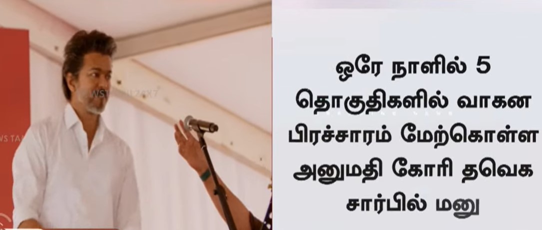 வரும் 28ஆம் தேதி, 5 தொகுதிகளில், தவெக தலைவர் விஜய் வாகன பிரச்சாரம் செய்ய அனுமதி கோரி, தவெக மனு அளித்து உள்ளது. பெரம்பூர் உள்ளிட்ட 5 தொகுதிகளில் காலை 10 மணி முதல் மாலை 4 மணி வரை பிரச்சாரம் செய்ய திட்டமிடப்பட்டு உள்ளது.