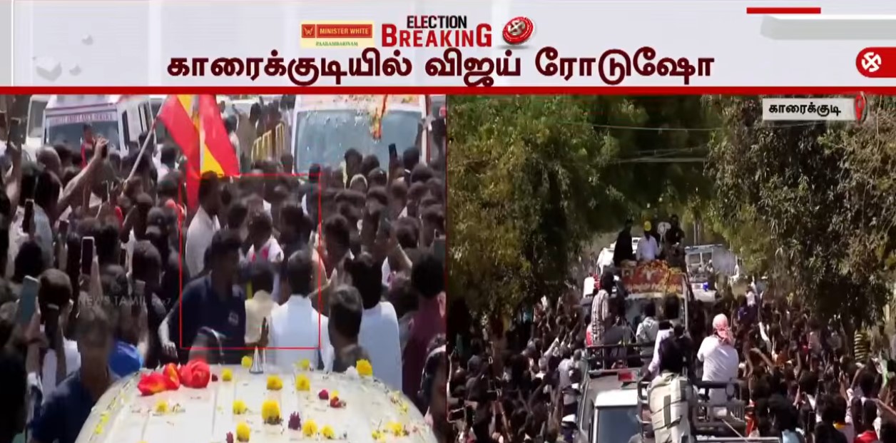 சிவகங்கை மாவட்டம், காரைக்குடி தொகுதியில் இன்று விஜய் பிரச்சாரம் செய்ய திட்டமிடப்பட்டிருந்தது. இதற்காக காவல் துறை அனுமதியும் அளித்திருந்தது. காரைக்குடியில் சிவகங்கை மாவட்டத்தைச் சேர்ந்த 4 வேட்பாளர்களுக்கும் ஆதரவாக விஜய் இன்று வாக்கு சேகரிப்பதாக இருந்தது. இதற்காக இன்று காலையில் சென்னையில் இருந்து தனி விமானம் மூலமாக மதுரை வந்த விஜய், அங்கிருந்து தனது பிரச்சார வாகனம் மூலமாக காரைக்குடிக்கு புறப்பட்டார்.
