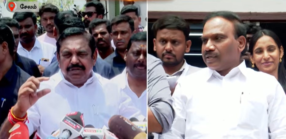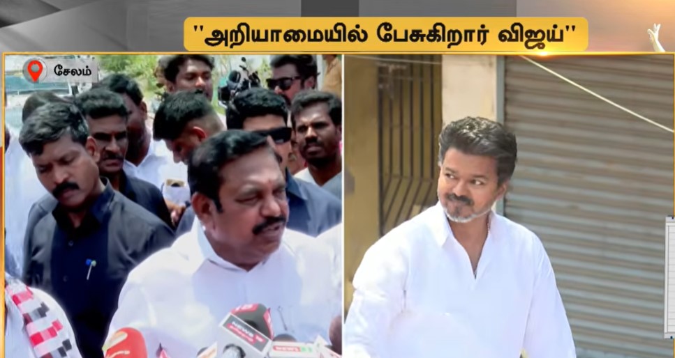 எடப்பாடி சட்டமன்ற தொகுதியில் வேட்பு மனு தாக்கல் செய்த பின்னர் செய்தியாளர்களை சந்தித்த எடப்பாடி பழனிசாமி, அறியாமையின் வெளிப்பாடாக திமுக வெர்சஸ் த.வெ.க. என விஜய் பேசி வருவதாக விமர்சித்தார். கருணாநிதியை வீட்டுச் சிறையில் வைத்திருந்ததாக கூறிய ஆ.ராசாவை விட்டு விட்டு முதலமைச்சர் மு.க.ஸ்டாலின் தன்னிடம் மோதிக் கொண்டிருக்கிறார் எனவும் எடப்பாடி பழனிசாமி கிண்டலடித்தார்.