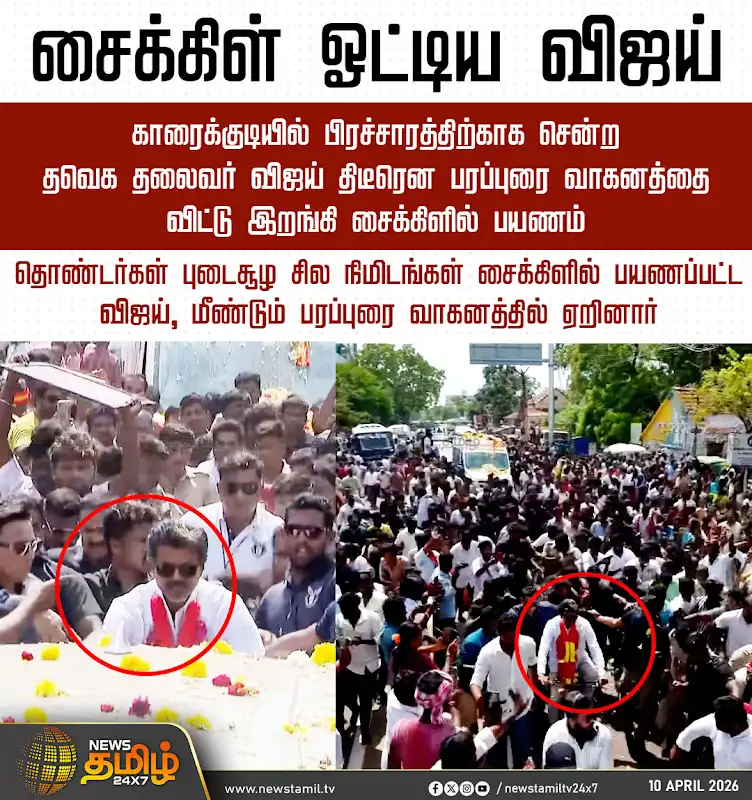 காரைக்குடியில் ரோடு ஷோ சென்ற தவெக தலைவர் விஜய் திடீரென பிரச்சார வாகனத்தில் இருந்து இறங்கி, சைக்கிள் ஓட்டிச் சென்றார்.