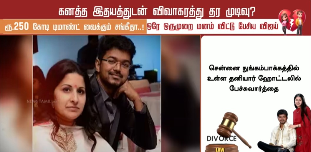 மகன், மகளை வைத்து தாம் எப்படி சமாளிக்க முடியும் என சங்கீதா குமுறிய நிலையில், இருவரையும் தாம் பார்த்துக் கொள்வதாக விஜய் உறுதியளித்ததாக கூறப்படுகிறது. வேட்புமனுவில் குறிப்பிட்டிருந்த சொத்து மதிப்பீட்டை குறிப்பிட்டு தனக்கும் தனது பிள்ளைகளுக்கும் சங்கீதா ஜீவனாம்சம் கேட்டதாக தெரிகிறது.