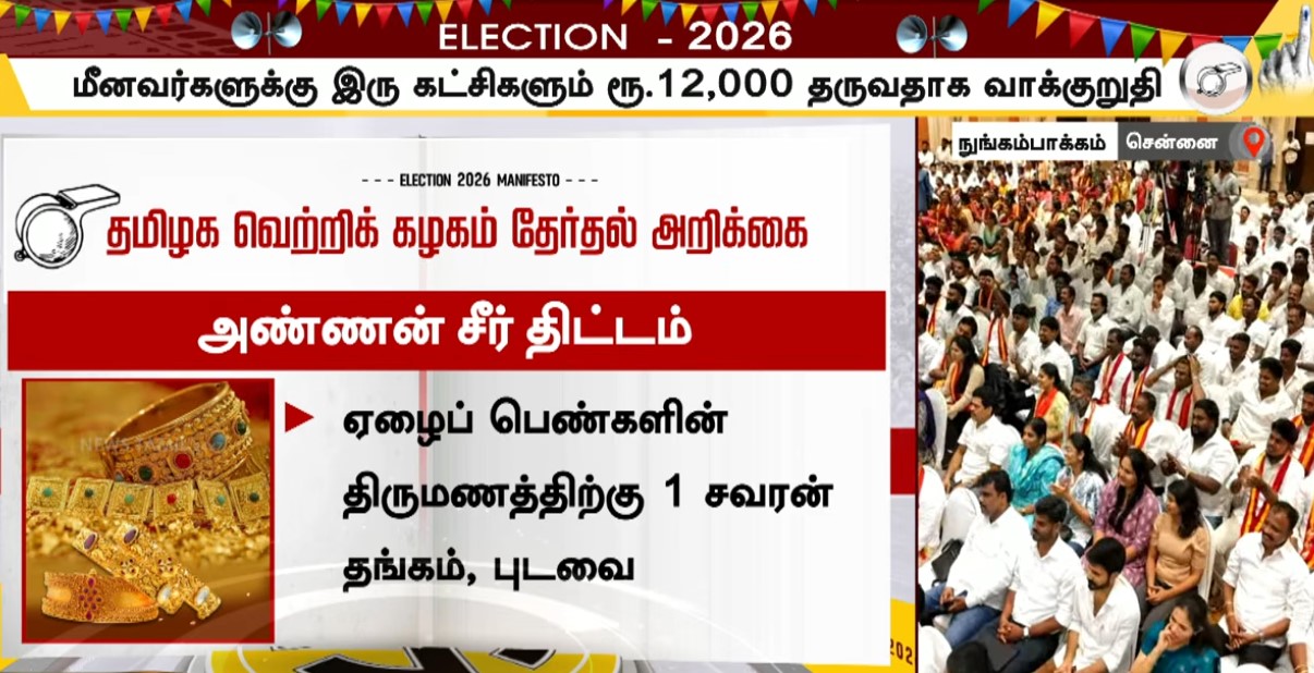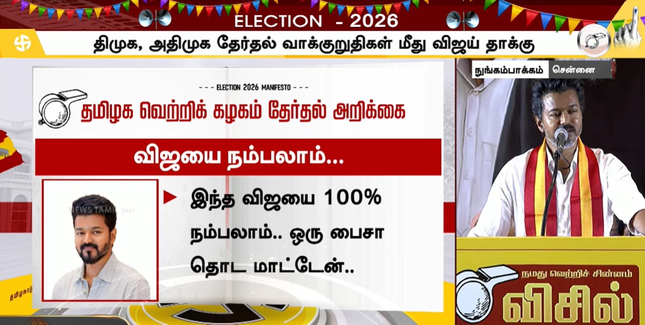 சென்னையில் தவெக தேர்தல் வாக்குறுதிகளை வெளியிட்ட விஜய் பேசியதாவது;