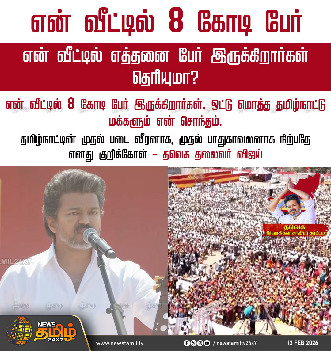 என்னைப் பற்றி பேசிய அந்தப் புள்ளியிலிருந்து ஆரம்பிக்கலாமா? ஏ, விஜய் வீட்டை விட்டு வெளியே வா, என்கிறார்கள். அவர்களுகு என் வீடு எதுன்னு தெரியுமா? எங்க இருக்குன்னு தெரியுமா? என்னை சீண்டிப் பார்ப்பதாக நினைத்து கேலியும் கிண்டலுமாக பேசுபவர்களுக்குச் சொல்கிறேன். தமிழ்நாடு உங்களுக்கு மாநிலமாக இருக்கலாம், ஆனால் தமிழ்நாடுதான் என் வீடு. என் வீட்டில் எத்தனை பேர் இருக்கிறார்கள் என்று தெரியுமா? 8 கோடி பேர் இருக்கிறார்கள். ஒட்டுமொத்த தமிழ்நாடும் என் வீடு, ஒட்டுமொத்த தமிழக மக்களும் என் சொந்தம். தமிழ்நாட்டின் முதல் படை வீரனாக அவர்கள் கூட நிற்க வேண்டும் என்பதுதான் என் குறிக்கோள். அந்த எட்டு கோடிப் பேருக்கும் எல்லாமுமாக நிற்கப் போவது இந்த விஜய் தான். எல்லாம் கொடுக்கப் போவதும் நான் தான்.
